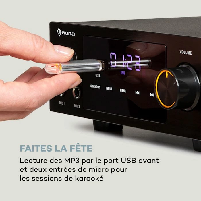 - Que la fête commence : Lecture MP3 par le port USB avant et deux entrées micro pour les sessions de karaoké