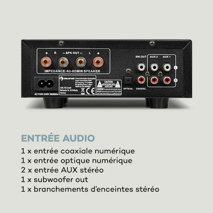 - Audio-Input : 1 x entrée numérique coaxiale, 1 x entrée numérique optique, 2 x entrée AUX stéréo, 1 x sortie de ligne stéréo, 2 x connexions d’enceintes stéréo