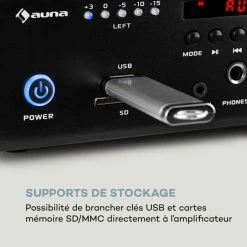 - Supports de stockage : branchez directement les clés USB et les cartes mémoire SD/MMC sur l’amplificateur
