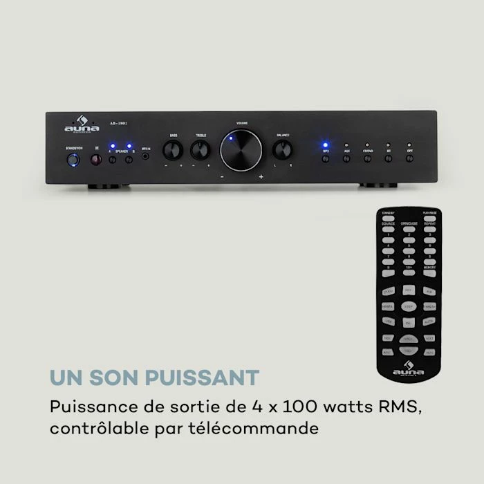 Un son puissant ! L’amplificateur stéréo hifi auna AV2-CD608BT amplifie les sons faibles. Avec sa puissance de sortie de 4 x 100 W RMS, il offre un son différencié de manière dynamique dans les graves, les médiums et les aigus.