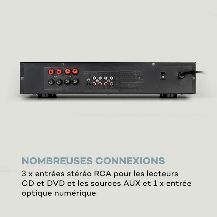 - Nombreuses connexions : 3 entrées stéréo RCA pour lecteurs CD & DVD et sources AUX et 1 entrée optique numérique