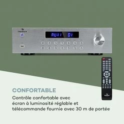- Connexions : 3 x entrées AUX stéréo RCA, 1 x sortie audio REC, 1x port USB, 1x entrée d’antenne RF, 4x 2 bornes d’enceintes