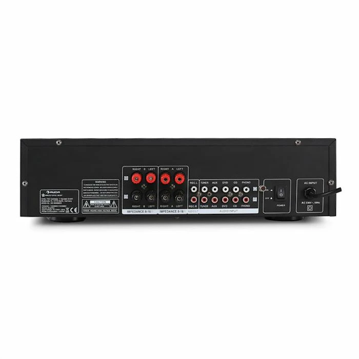 L’Auna AV2-CD708 est un amplificateur HiFi convaincant aux fonctionnalités considérables et à bonne technique sonore. Les connexions de cet ampli répondent aux standards HiFi d’usage. Une sortie casque frontale permet l’écoute nocture de musique. La façade arrière propose cinq entrées RCA-Line pour le branchement de tuners FM, platines K7 et lecteurs CD et DVD, ainsi que de signaux phono et AUX. Une sortie Cinch-Line permet de rediffuser les signaux d’entrée vers d’autres appareils sans problème.