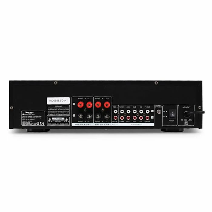 L’Auna AV2-CD708 est un amplificateur HiFi convaincant aux fonctionnalités considérables et à bonne technique sonore. Les connexions de cet ampli répondent aux standards HiFi d’usage. Une sortie casque frontale permet l’écoute nocture de musique. La façade arrière propose cinq entrées RCA-Line pour le branchement de tuners FM, platines K7 et lecteurs CD et DVD, ainsi que de signaux phono et AUX. Une sortie Cinch-Line permet de rediffuser les signaux d’entrée vers d’autres appareils sans problème.