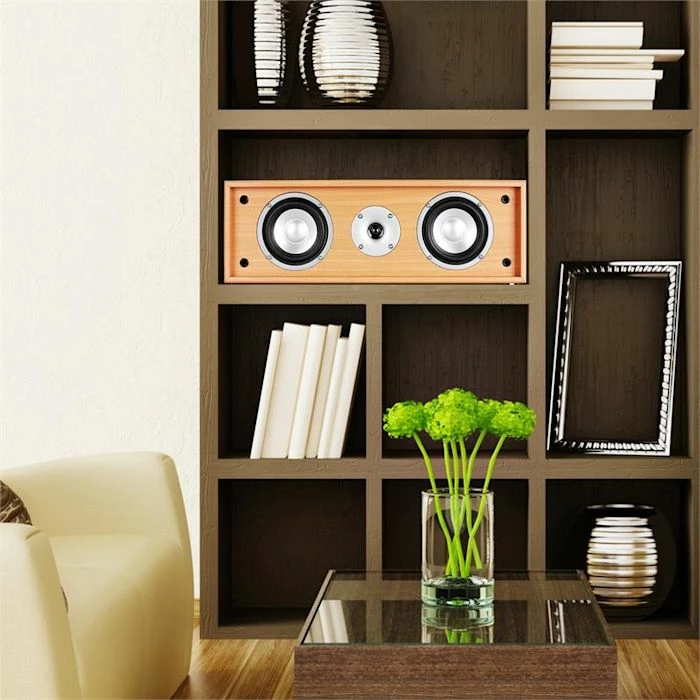 - Enceinte centrale passive à 2 voies avec deux subwoofers de 10cm (4″) et 35 watts RMS de puissance
