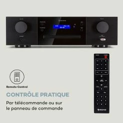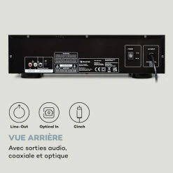 - Connexions : 1 x entrée USB (avant), 1 x sortie audio optique, 1 x sortie audio coaxiale, 1 x sortie RCA stéréo