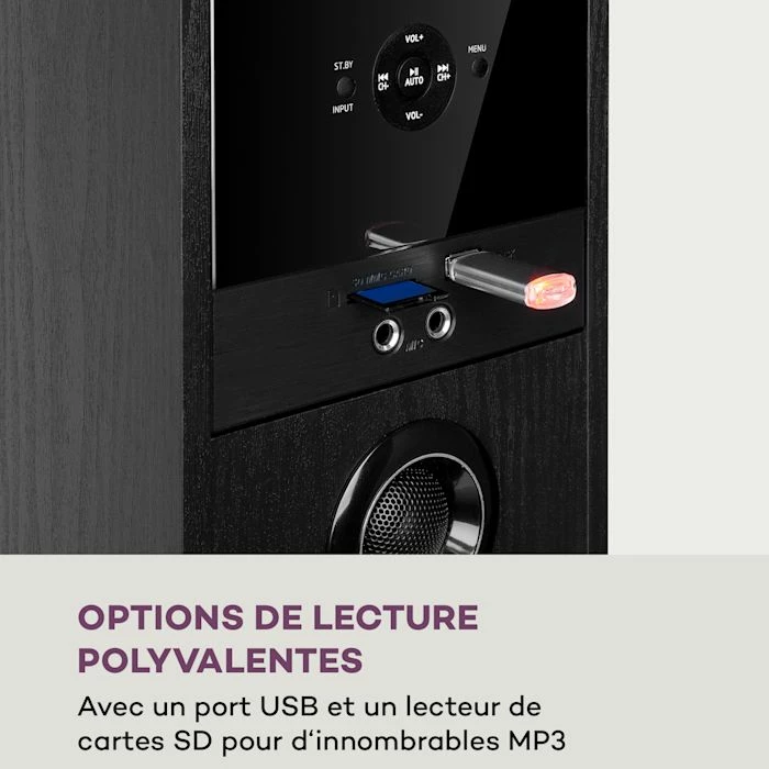 - Options de lecture polyvalentes : incluant un port USB et un emplacement SD pour d’innombrables MP3
