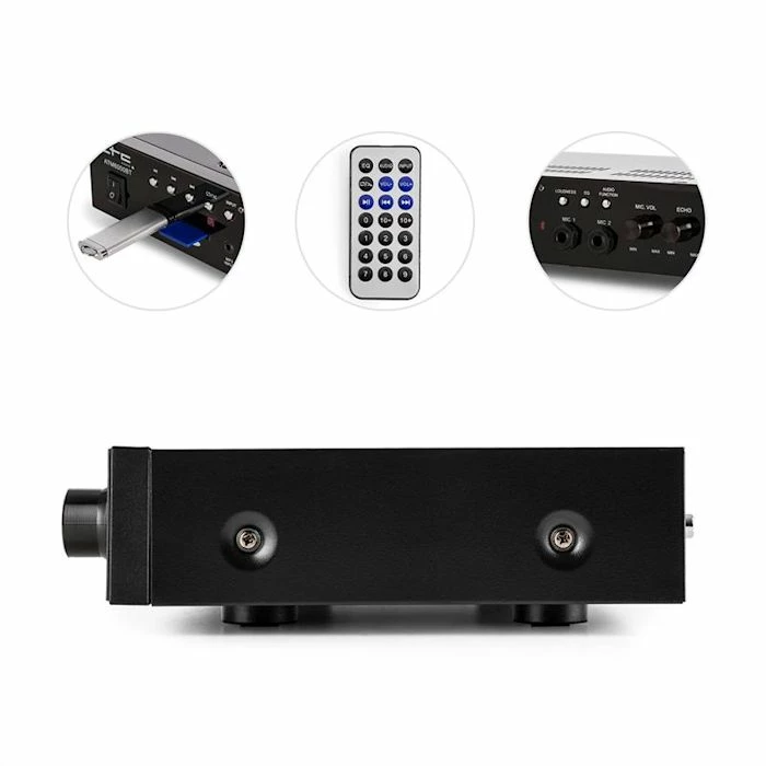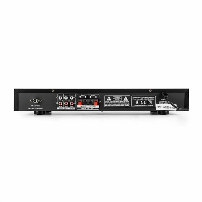 - Connectiques : 1 x port USB, 1 x slot SD, 2 x entrée micro jack 6,3mm, 1 x entrée DVD stéréo RCA, 1 x entrée ligne stéréo RCA AUX, 1 x entrée jack 6,3mm MP§, 1 x sortie ligne stéréo RCA, 1 x sortie casque jack 3,5mm, 1 x set de prises haut-parleurs, 1 x prise antenne