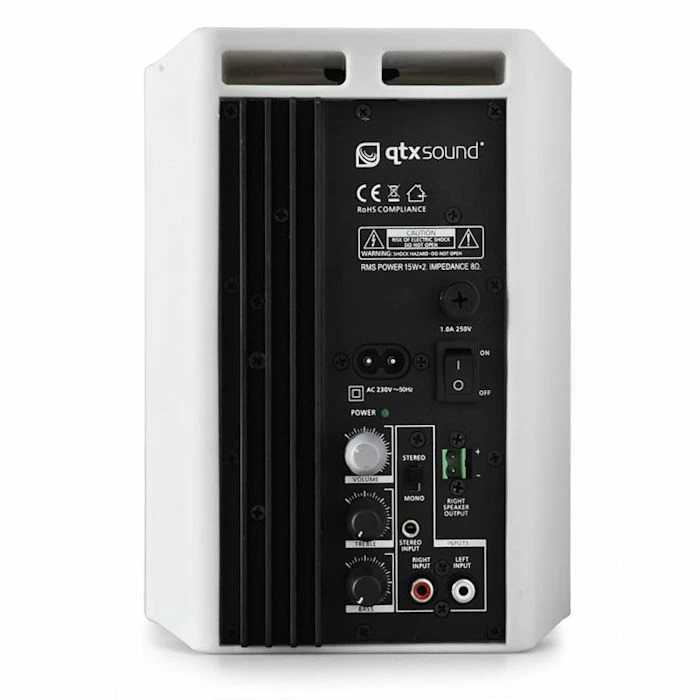 - Connectiqueshaut-parleur actif : 1 x entrée ligne stéréo Cinch/RCA, 1 x entrée Jack 3,5mmauxiliaire, 1 x sortie pour câble de haut-parleur